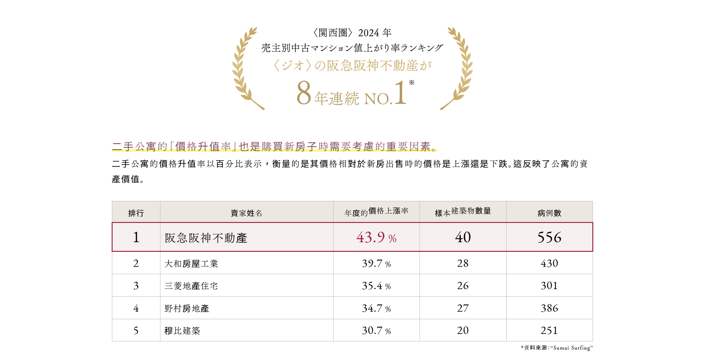 根據日本不動產數據平台 sumai-surfin 統計,GEO 在過去 八年間的關西中古公寓漲價率均位居第一。其背後仰賴品牌對「選址、建築品質、社區管理」三項核心因素的長期堅持,也形成 GEO 系列的資產性基礎。