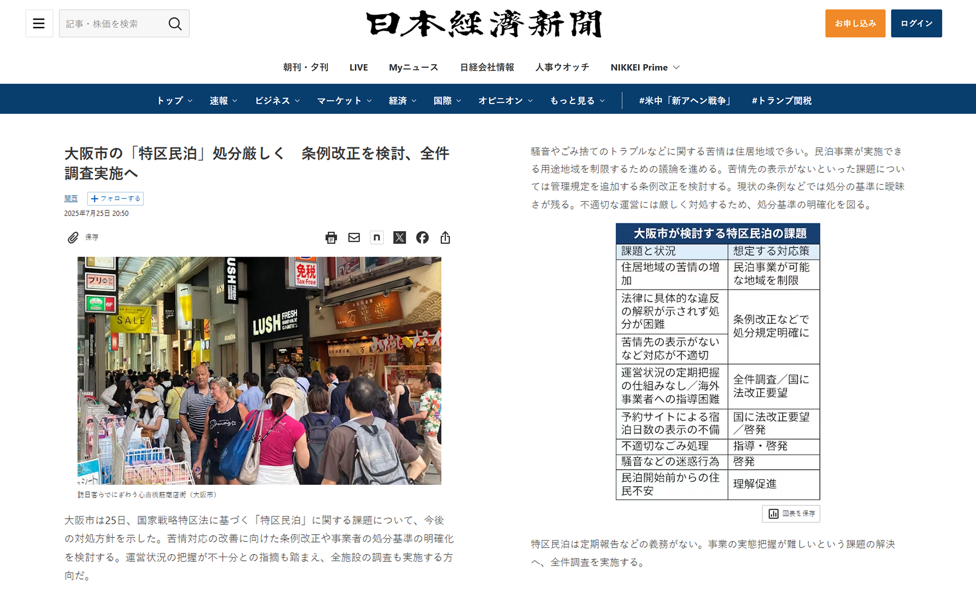 據《日本經濟新聞》報導,大阪市 於2025/7/25 日召開跨部門檢討會議,針對特區民宿制度存在的問題進行深入討論。會中公布一份詳列八大課題及對應策略的文件,包括住宅區域苦情案件增加、法律違規處分標準不明確、苦情申訴管道標示不當等問題。