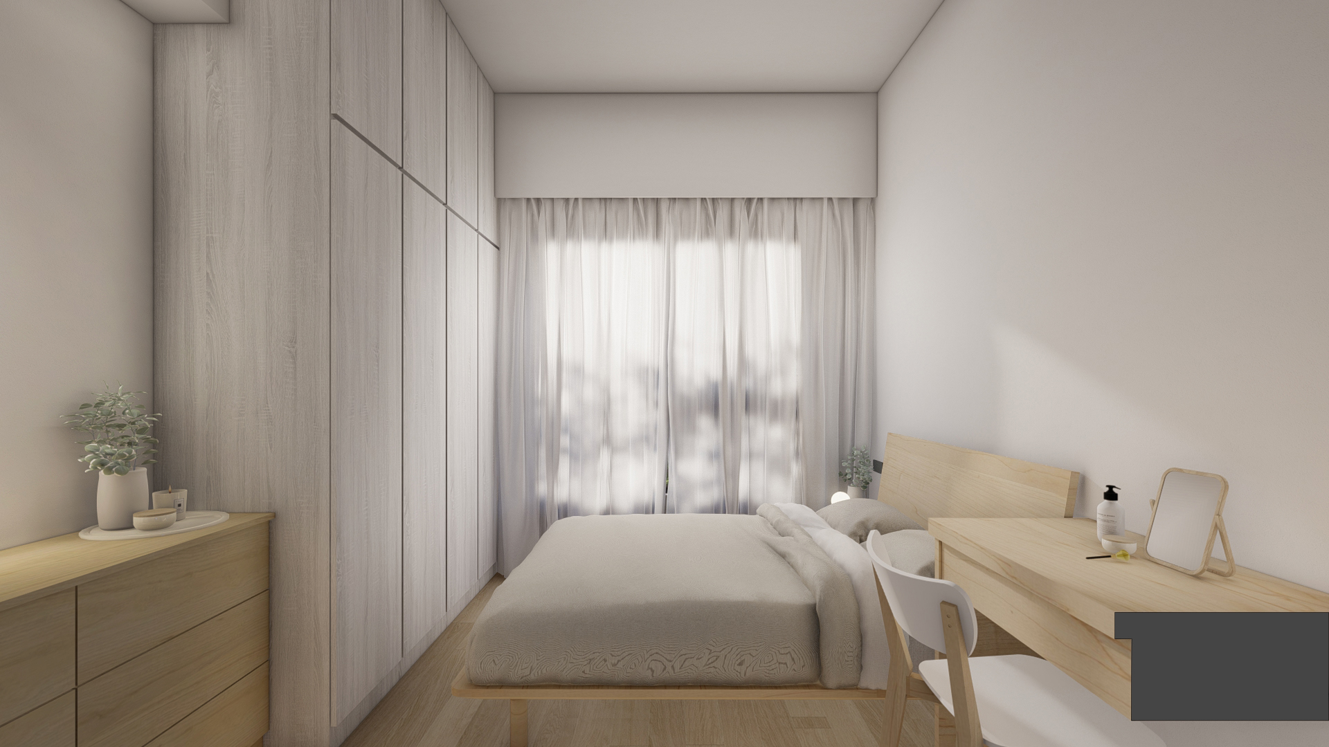 ( maaūu 為建案「和岩花現」製作公設及室內渲染圖,渲染的目的是渲出引人想像的空間,讓人看著圖就能感受到床上的暖陽。 )