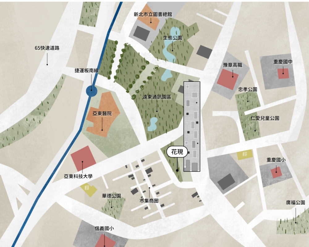 (maaūu 為建案「和岩花現」製作生活機能圖,以統合視覺體系進行設計。)