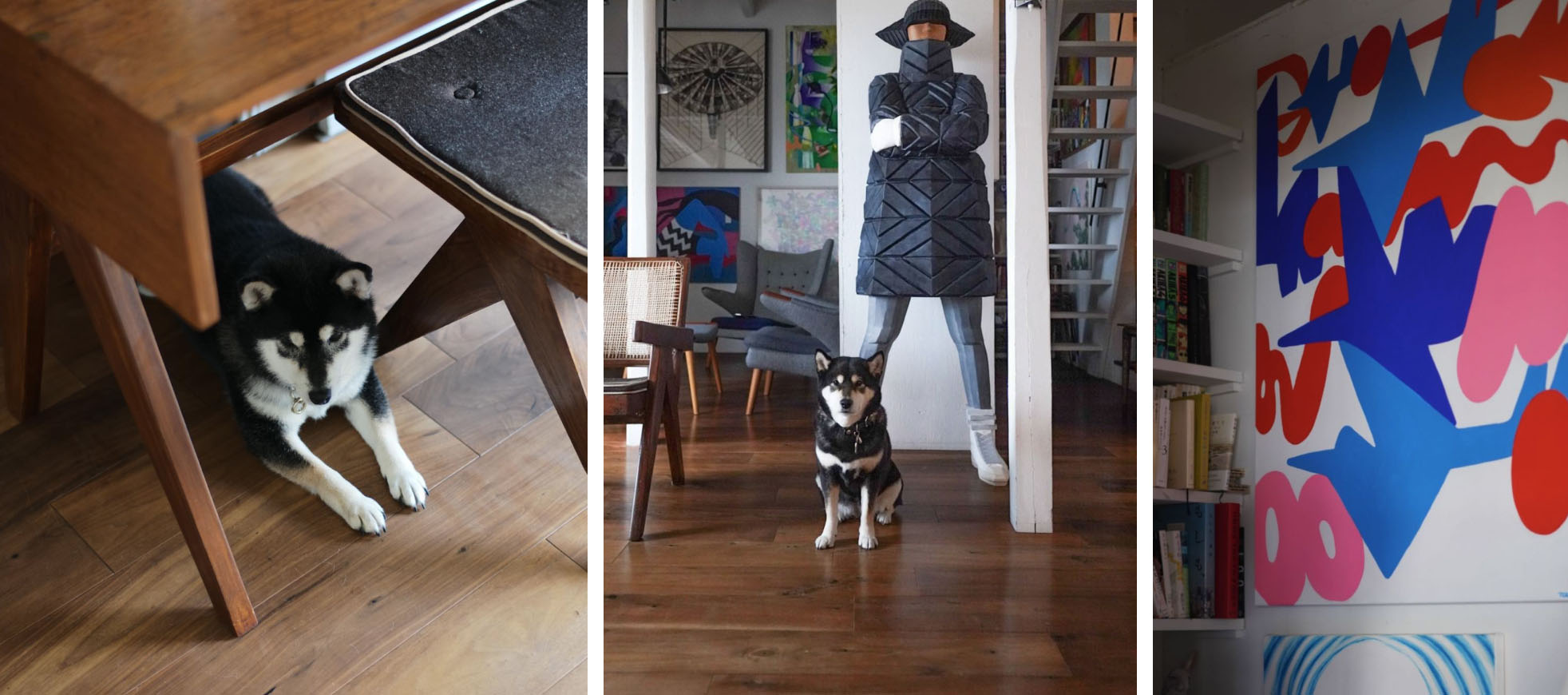 裸露天花、裸露結構柱、陽光灑落的實木地板、過分常見卻百看不厭的 pierrejeanneret藤編椅、純白電風扇、以及滿屋子藝術藏品和空間中的靈魂角色:兩隻黑柴。即便可見的裝修密度不高,卻沒有人會否認這間屋子的強烈風格。