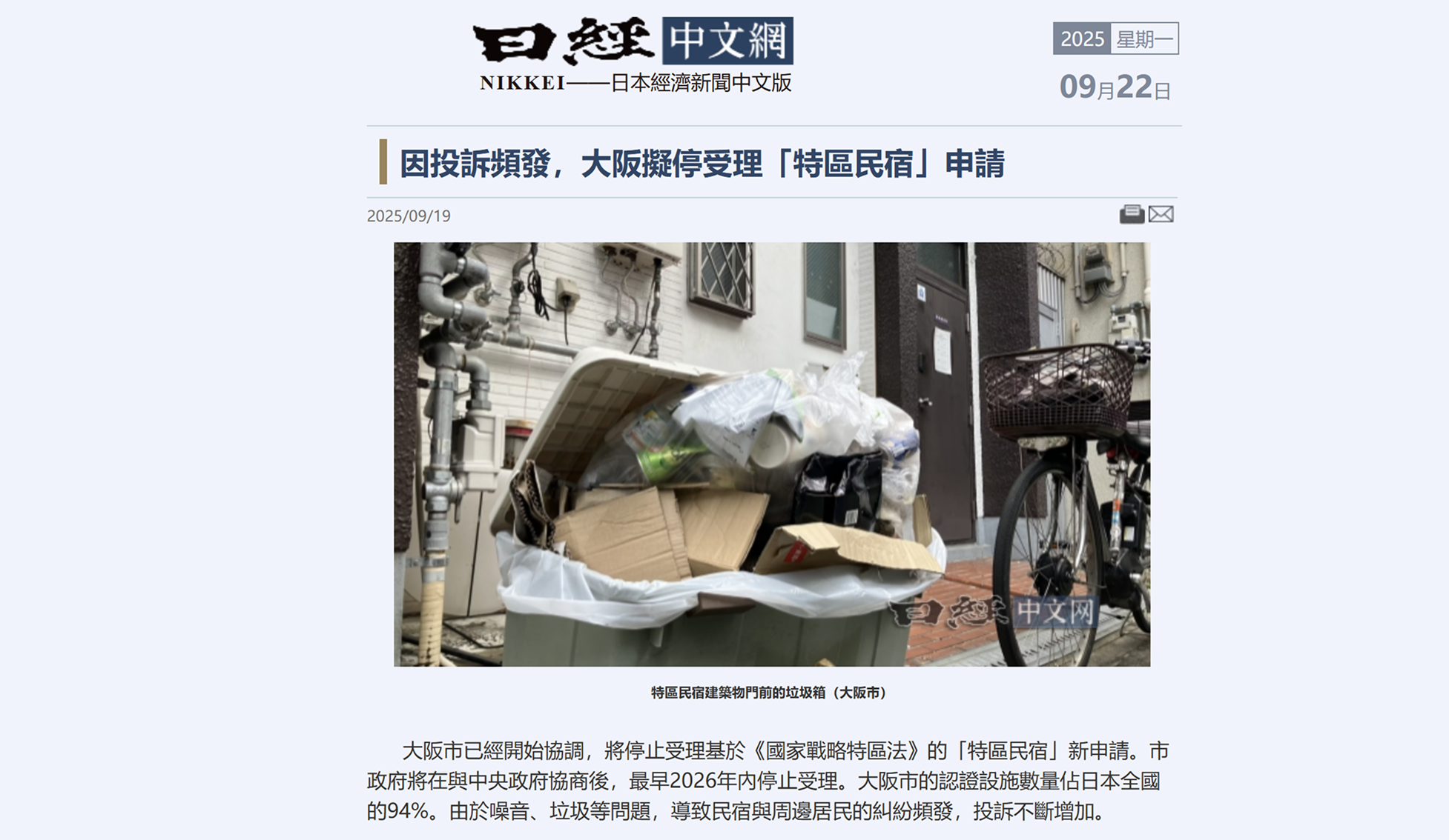 「大阪市已經開始協調,將停止受理基於《國家戰略特區法》的『特區民宿』新申請。……由於噪音、垃圾等問題,導致民宿與周邊居民的糾紛頻發,投訴不斷增加。」(日經新聞,2025/09/19)