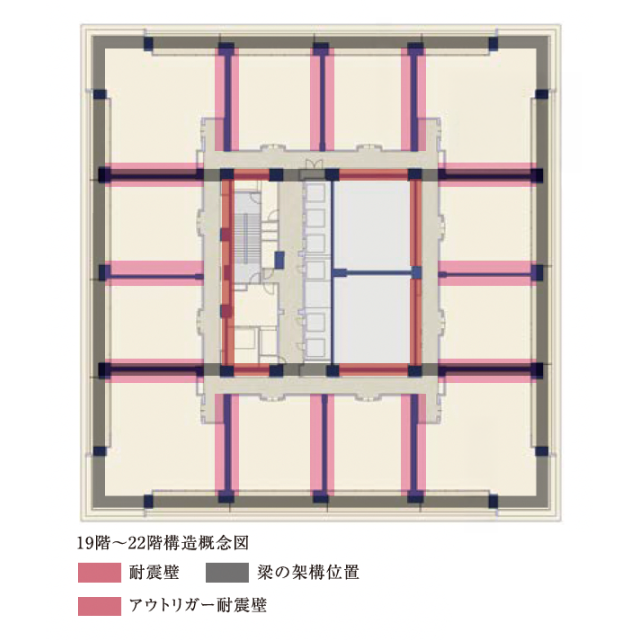 結合核心筒結構與外圍支撐系統,並透過 Outrigger 補強整體剛性。 於基礎層導入免震裝置,有效降低地震能量傳遞。