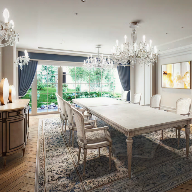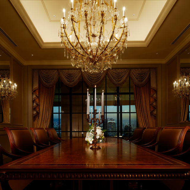 水晶吊燈與長桌配置,呈現宮廷式宴會氛圍,強化高端社交與接待機能。