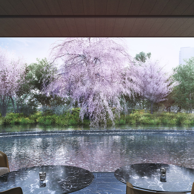 宛若一幅被珍藏的春日畫境,繽紛林景與流動水韻交織共鳴,醞釀專屬於居者的從容與尊榮時光。
