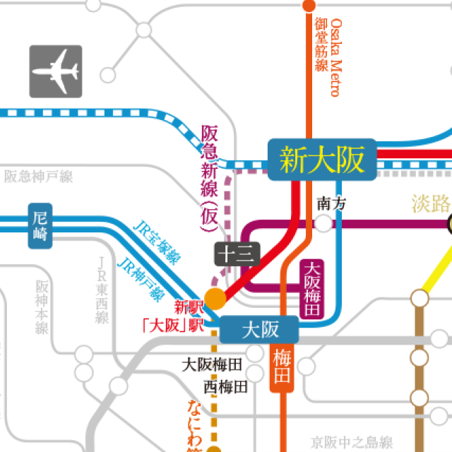 串聯 7 大車站與 13 條交通路線,同時便捷連接關西國際機場、大阪機場與新大阪站,成為備受國內外矚目的發展焦點。