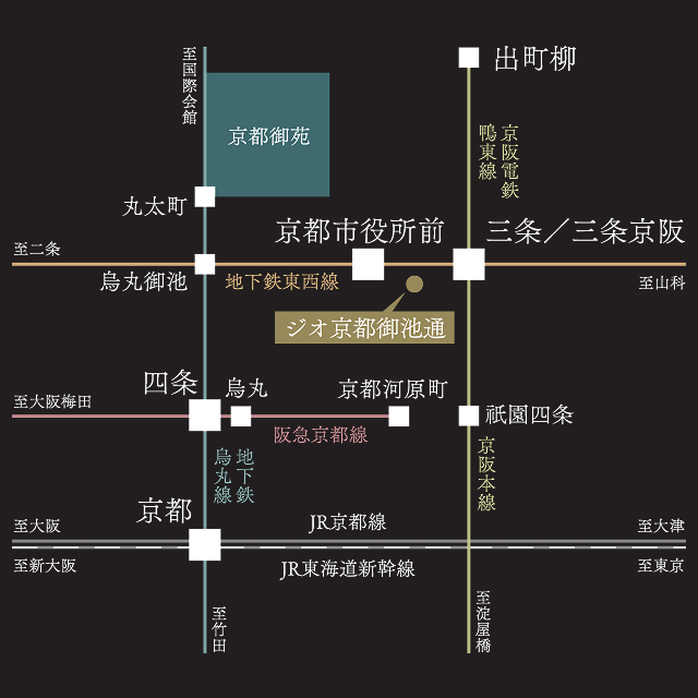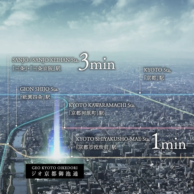 Geo 京都御池通坐落京都中心軸線,擁有罕見的「站前 1 分鐘」距離, 東西線與京阪本線交織成 2 線 3 站的豐富交通網。 無論通勤、觀光、返家,每一次移動都以最短動線抵達目的地, 是京都市區少數兼具靈活性與可預測性的核心據點。