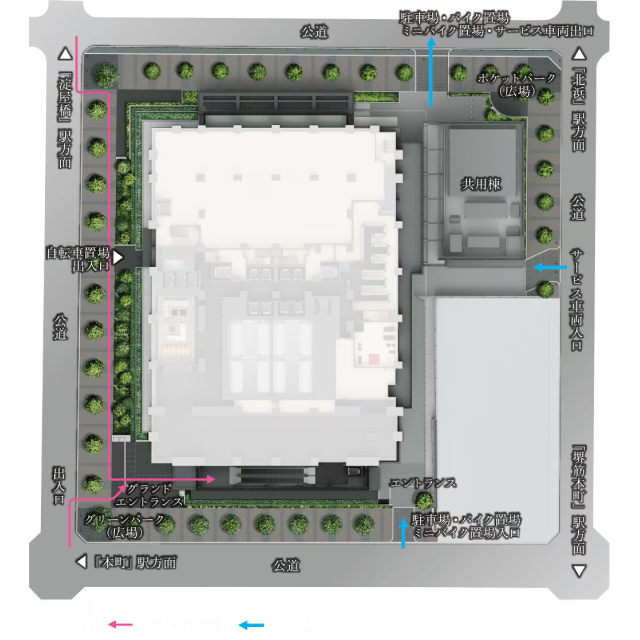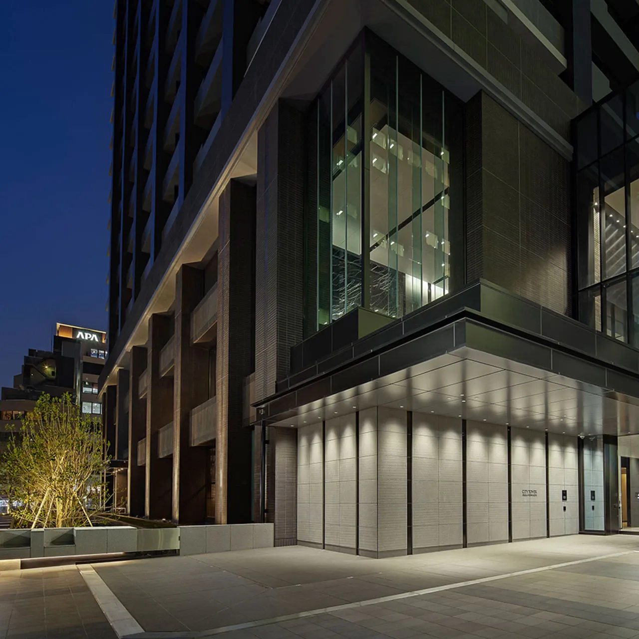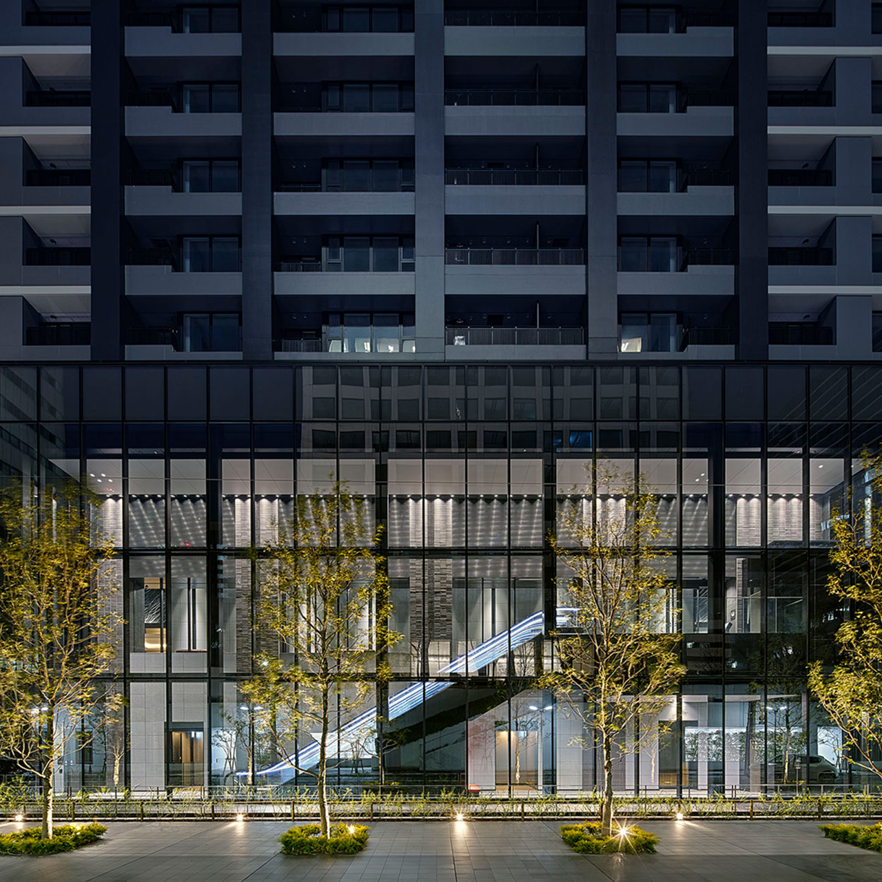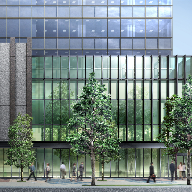 景觀設計以高木作為象徵性植栽,四季皆展現沉穩綠意。超高層塔樓腳下形塑清涼蔭影,為周圍街景帶來寧靜、舒緩且療癒的都心風景。